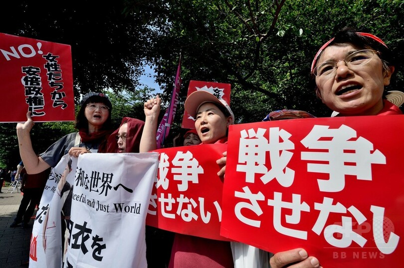 【6月21日 AFP】都内の国会周辺で20日、安倍晋三(Shinzo Abe)首相が成立を目指している安全保障関連法案に抗議するデモが行われた。女性を中心とした何千人もの参加者らは赤い服を着て人間の鎖を作り、国会議事堂を取り囲んだ。(c)AFP