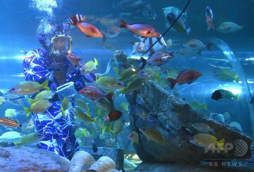 【6月29日 AFP】「七夕水中ショー」を開催中の東京・品川のしながわ水族館(Shinagawa Aquarium)では、浴衣姿のダイバーによる餌付けパフォーマンスが披露されている。イベントの会期は7月6日まで。(c)AFP