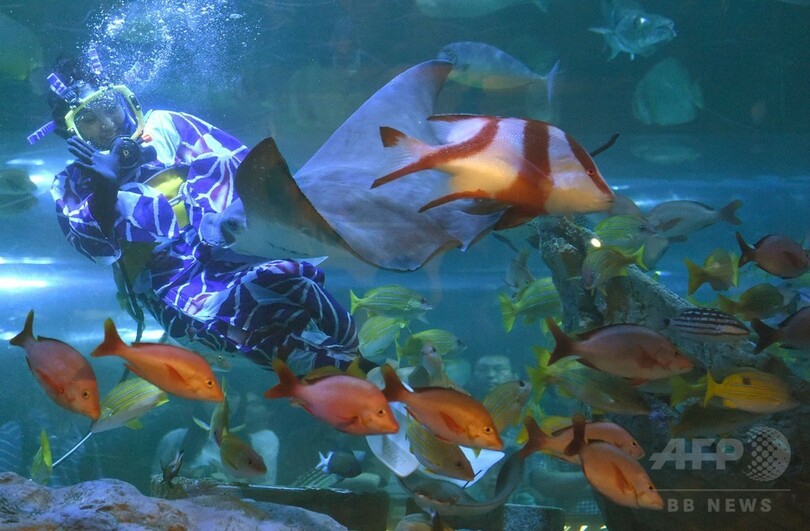 【6月29日 AFP】「七夕水中ショー」を開催中の東京・品川のしながわ水族館(Shinagawa Aquarium)では、浴衣姿のダイバーによる餌付けパフォーマンスが披露されている。イベントの会期は7月6日まで。(c)AFP