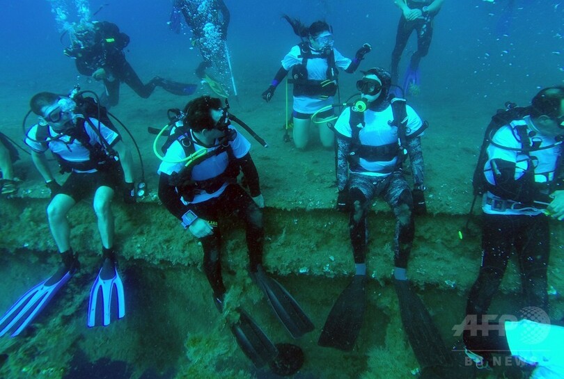 【6月29日 AFP】地中海の島国キプロスのラルナカ(Larnaca)沖で28日、海に沈んでいるスウェーデンのフェリー「ゼノビア号(MS Zenobia)」を目当てに潜る沈船ダイビング・イベント「マス・ダイブ(Mass Dive)」が開催され、120人を超えるダイバーが参加した。(c)AFP