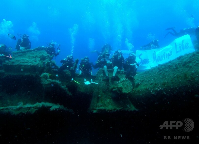 【6月29日 AFP】地中海の島国キプロスのラルナカ(Larnaca)沖で28日、海に沈んでいるスウェーデンのフェリー「ゼノビア号(MS Zenobia)」を目当てに潜る沈船ダイビング・イベント「マス・ダイブ(Mass Dive)」が開催され、120人を超えるダイバーが参加した。(c)AFP