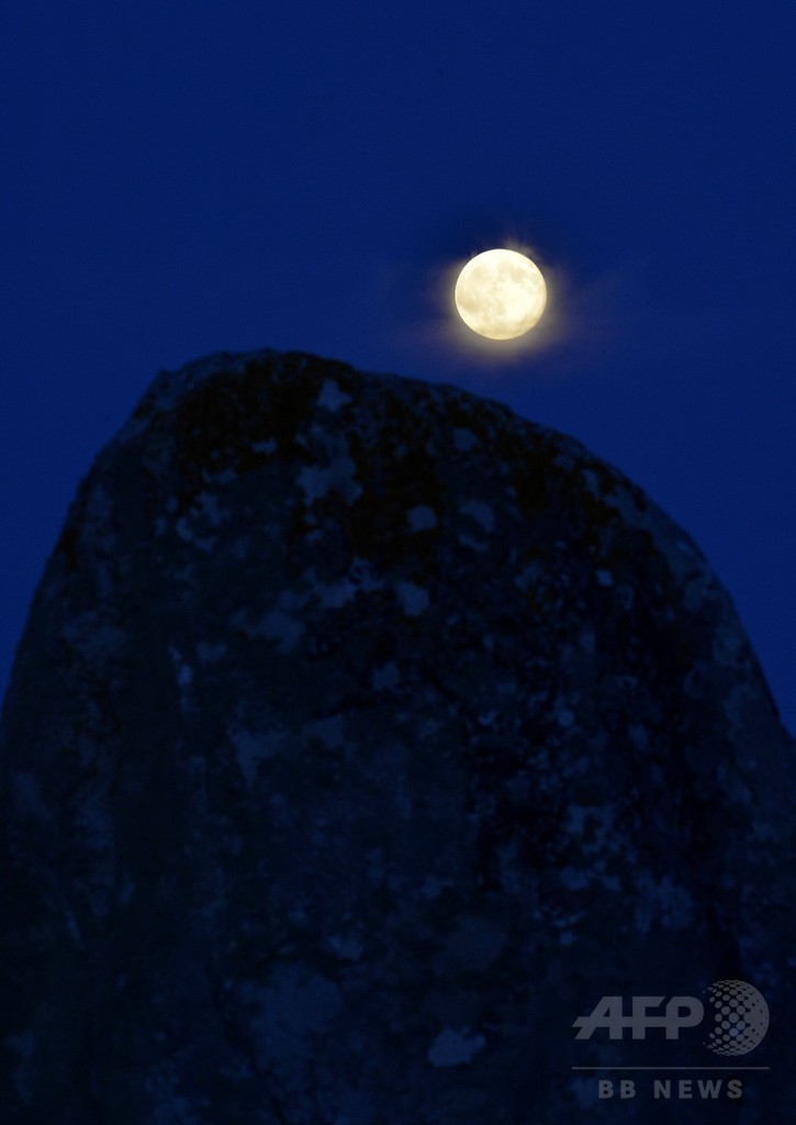 【7月3日 AFP】仏北西部ブルターニュ(Brittany)地方プルーアルネル(Plouharnel)のサント・バルブ(Sainte-Barbe)で2日、空へ昇る満月を見物しようと、巨石遺構に多くの人びとが集まった。(c)AFP