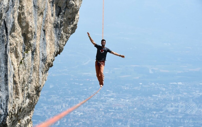 【7月4日 AFP】フランス東部グルノーブル(Grenoble)近くのランスアンベルコール(Lans-en-Vercors)で3日、木と木の間などに張ったベルトの上を綱渡りのように歩く競技、スラックラインのイベント「マーモット・ハイライン・プロジェクト(Marmotte Highline Project)」が行われた。