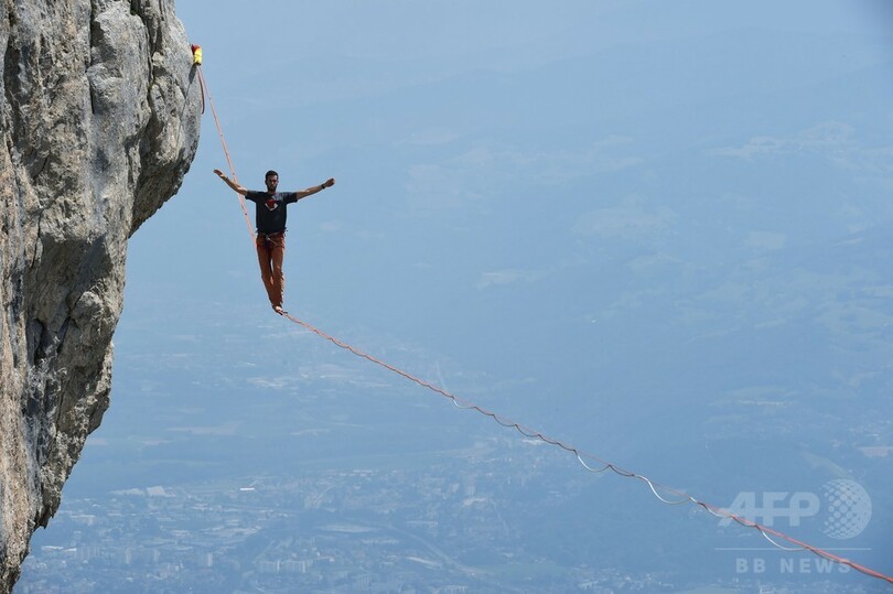 【7月4日 AFP】フランス東部グルノーブル(Grenoble)近くのランスアンベルコール(Lans-en-Vercors)で3日、木と木の間などに張ったベルトの上を綱渡りのように歩く競技、スラックラインのイベント「マーモット・ハイライン・プロジェクト(Marmotte Highline Project)」が行われた。