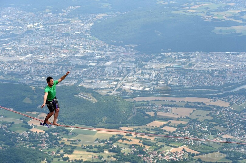 【7月4日 AFP】フランス東部グルノーブル(Grenoble)近くのランスアンベルコール(Lans-en-Vercors)で3日、木と木の間などに張ったベルトの上を綱渡りのように歩く競技、スラックラインのイベント「マーモット・ハイライン・プロジェクト(Marmotte Highline Project)」が行われた。
