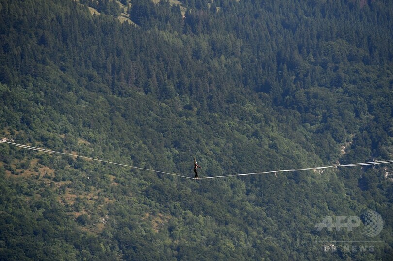 【7月4日 AFP】フランス東部グルノーブル(Grenoble)近くのランスアンベルコール(Lans-en-Vercors)で3日、木と木の間などに張ったベルトの上を綱渡りのように歩く競技、スラックラインのイベント「マーモット・ハイライン・プロジェクト(Marmotte Highline Project)」が行われた。