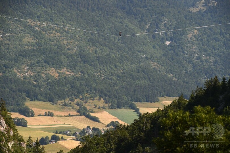 【7月4日 AFP】フランス東部グルノーブル(Grenoble)近くのランスアンベルコール(Lans-en-Vercors)で3日、木と木の間などに張ったベルトの上を綱渡りのように歩く競技、スラックラインのイベント「マーモット・ハイライン・プロジェクト(Marmotte Highline Project)」が行われた。