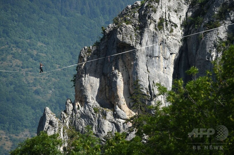 【7月4日 AFP】フランス東部グルノーブル(Grenoble)近くのランスアンベルコール(Lans-en-Vercors)で3日、木と木の間などに張ったベルトの上を綱渡りのように歩く競技、スラックラインのイベント「マーモット・ハイライン・プロジェクト(Marmotte Highline Project)」が行われた。