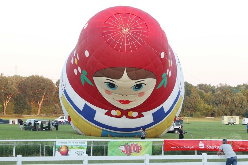 【7月5日 AFP】ドイツ・ハレ(Halle)で2日に開幕したザクセン国際気球フェスティバル(Saxonia International Balloon Fiesta)の会場となっている競馬場に、ロシアの伝統的な民芸品「マトリョーシカ人形」をかたどった気球が登場した。 (c)AFP
