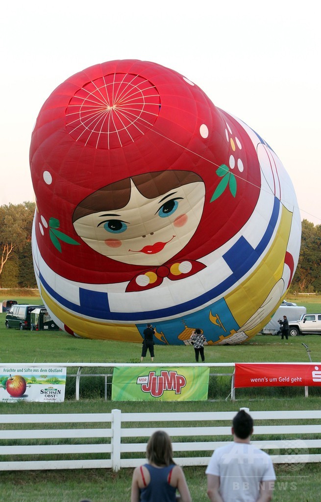 【7月5日 AFP】ドイツ・ハレ(Halle)で2日に開幕したザクセン国際気球フェスティバル(Saxonia International Balloon Fiesta)の会場となっている競馬場に、ロシアの伝統的な民芸品「マトリョーシカ人形」をかたどった気球が登場した。 (c)AFP