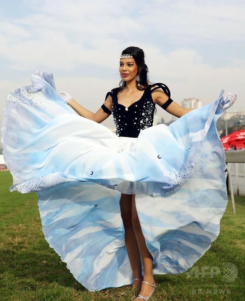 レース開催中には、ファッションコンテストも行われ、ドレスアップした多くのセレブリティーたちがレースを見に来場した。(c)AFP