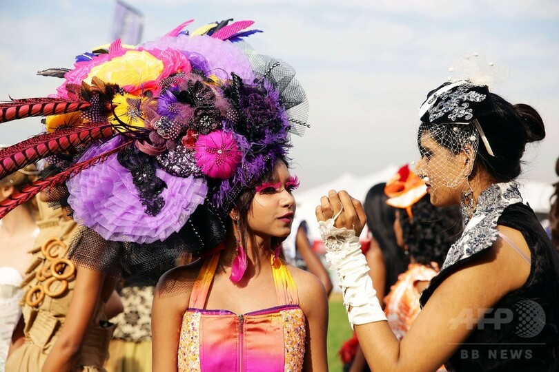 レース開催中には、ファッションコンテストも行われ、ドレスアップした多くのセレブリティーたちがレースを見に来場した。(c)AFP