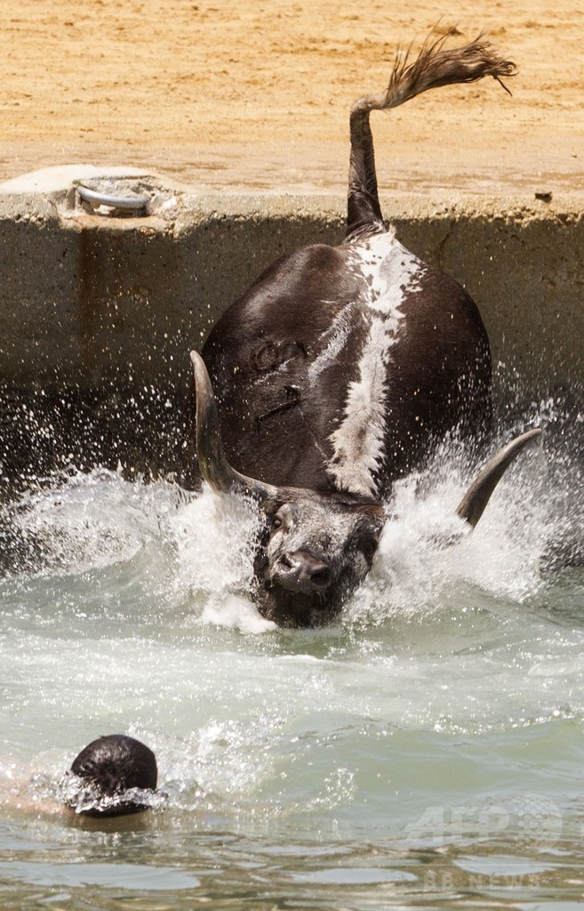 ニュース ライフ 牛の突撃かわしてドボン!スペイン伝統の「海の牛追い祭り」 2015年7月8日 10:27 発信地:デニア/スペイン [ ヨーロッパ スペイン ] このニュースをシェア ‹ › ❮ 5/10 ❯ スペイン・デニアで開かれた「海の牛追い祭り」で、海に飛び込む牛(2015年7月7日撮影)。(c)AFP/JOSE JORDAN 画像作成中 ! 【7月8日 AFP】スペインの港町デニア(Denia)で7日、伝統的な「海の牛追い祭り」が開かれ、参加者と牛が次々に海に飛び込んだ。(c)AFP ライフ 一覧へ> メディア・報道関係・法人の方向け 写真・動画 購入のお問合せ>