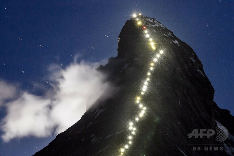 【7月14日 AFP】スイス西部ツェルマット(Zermatt)は13日夜、スイスとイタリアの国境の山「マッターホルン(Matterhorn)」の初登頂が成功したときの登山路に明かりがともされ、マッターホルン初登頂150年を記念するお祝いムードに包まれた。