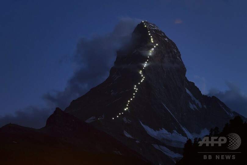【7月14日 AFP】スイス西部ツェルマット(Zermatt)は13日夜、スイスとイタリアの国境の山「マッターホルン(Matterhorn)」の初登頂が成功したときの登山路に明かりがともされ、マッターホルン初登頂150年を記念するお祝いムードに包まれた。