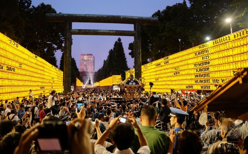 【7月14日 AFP】東京都内の靖国神社(Yasukuni Shrine)で13~16日、戦没者を慰霊する「みたままつり」が開催されている。境内には約3万個の提灯(ちょうちん)が掲げられ、大勢の参拝客でにぎわっている。(c)AFP