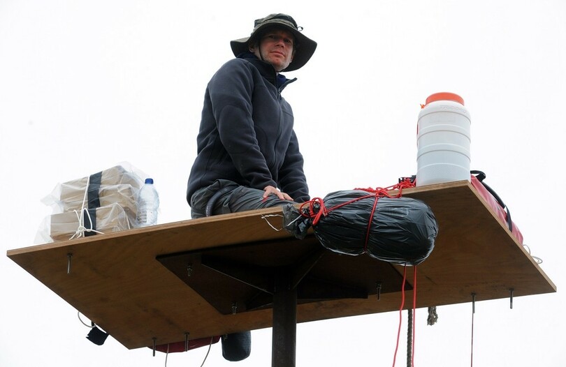 【7月16日 AFP】フランス西部エスキビアン(Esquibien)の海岸沿いに設置された柱の最頂部に立つ仏美術作家のアブラアム・ポワンシュバル(Abraham Poincheval)さん。これは、パフォーマンス作品「La Vigie(監視所)」の一環として行われたもので、1週間にわたり滞在する予定だという。(c)AFP