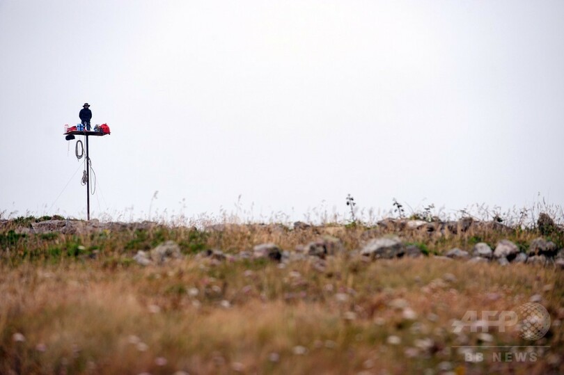 【7月16日 AFP】フランス西部エスキビアン(Esquibien)の海岸沿いに設置された柱の最頂部に立つ仏美術作家のアブラアム・ポワンシュバル(Abraham Poincheval)さん。これは、パフォーマンス作品「La Vigie(監視所)」の一環として行われたもので、1週間にわたり滞在する予定だという。(c)AFP