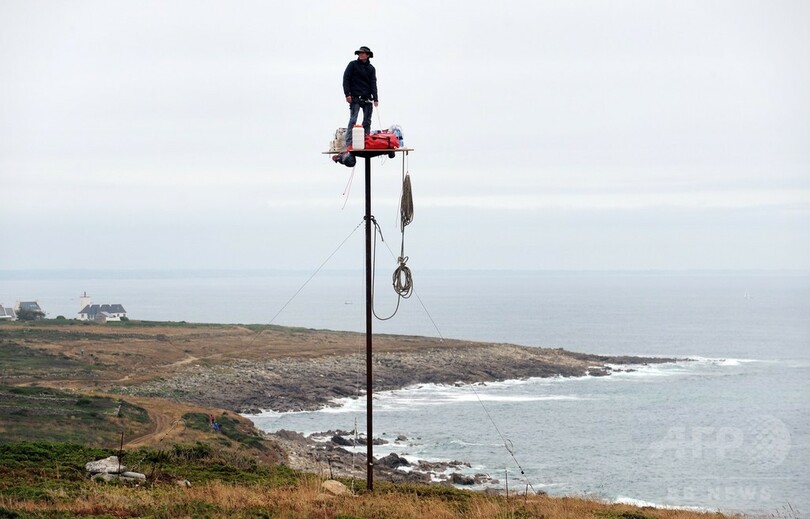 【7月16日 AFP】フランス西部エスキビアン(Esquibien)の海岸沿いに設置された柱の最頂部に立つ仏美術作家のアブラアム・ポワンシュバル(Abraham Poincheval)さん。これは、パフォーマンス作品「La Vigie(監視所)」の一環として行われたもので、1週間にわたり滞在する予定だという。(c)AFP