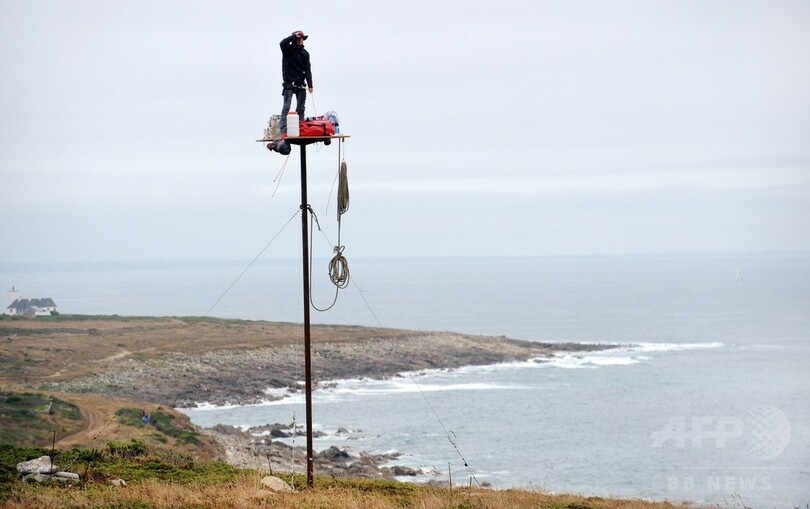 【7月16日 AFP】フランス西部エスキビアン(Esquibien)の海岸沿いに設置された柱の最頂部に立つ仏美術作家のアブラアム・ポワンシュバル(Abraham Poincheval)さん。これは、パフォーマンス作品「La Vigie(監視所)」の一環として行われたもので、1週間にわたり滞在する予定だという。(c)AFP