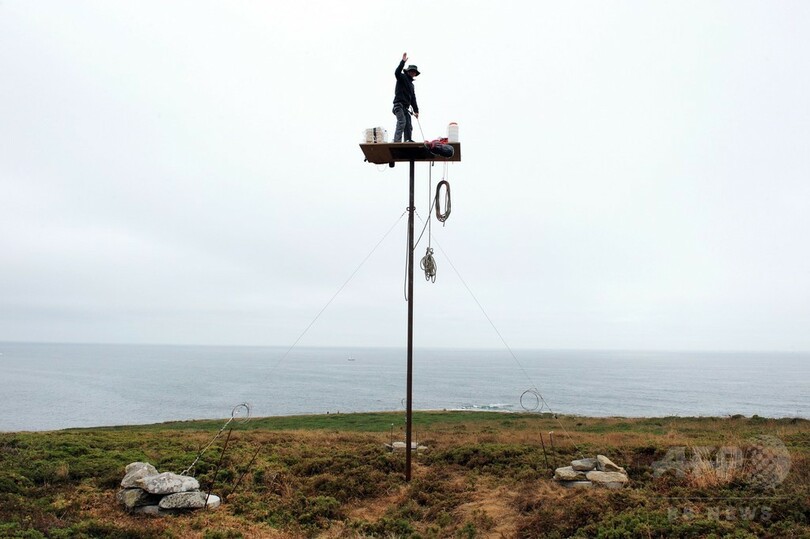 【7月16日 AFP】フランス西部エスキビアン(Esquibien)の海岸沿いに設置された柱の最頂部に立つ仏美術作家のアブラアム・ポワンシュバル(Abraham Poincheval)さん。これは、パフォーマンス作品「La Vigie(監視所)」の一環として行われたもので、1週間にわたり滞在する予定だという。(c)AFP