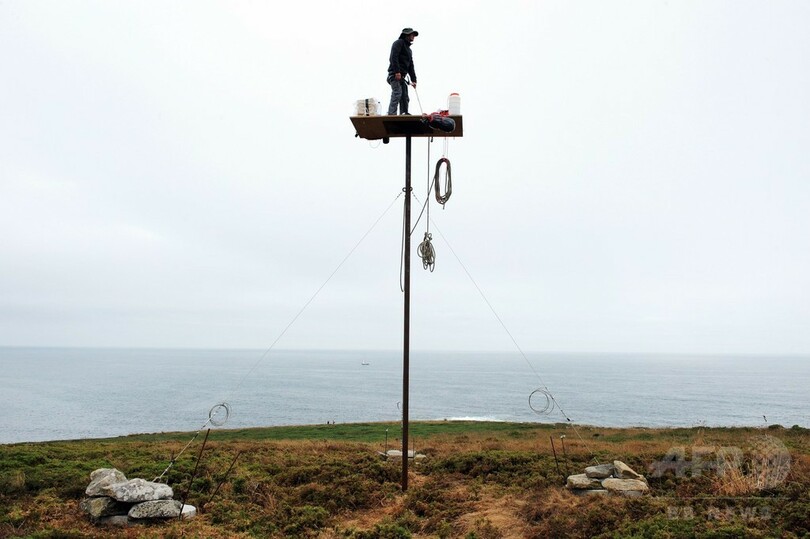 【7月16日 AFP】フランス西部エスキビアン(Esquibien)の海岸沿いに設置された柱の最頂部に立つ仏美術作家のアブラアム・ポワンシュバル(Abraham Poincheval)さん。これは、パフォーマンス作品「La Vigie(監視所)」の一環として行われたもので、1週間にわたり滞在する予定だという。(c)AFP