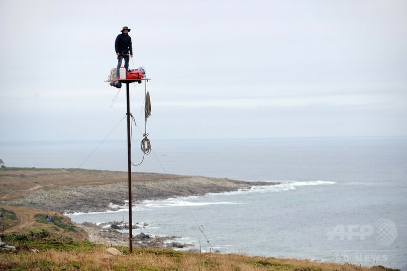 【7月16日 AFP】フランス西部エスキビアン(Esquibien)の海岸沿いに設置された柱の最頂部に立つ仏美術作家のアブラアム・ポワンシュバル(Abraham Poincheval)さん。これは、パフォーマンス作品「La Vigie(監視所)」の一環として行われたもので、1週間にわたり滞在する予定だという。(c)AFP