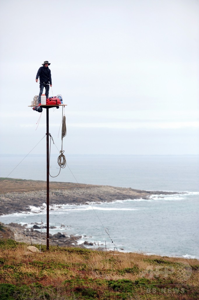 【7月16日 AFP】フランス西部エスキビアン(Esquibien)の海岸沿いに設置された柱の最頂部に立つ仏美術作家のアブラアム・ポワンシュバル(Abraham Poincheval)さん。これは、パフォーマンス作品「La Vigie(監視所)」の一環として行われたもので、1週間にわたり滞在する予定だという。(c)AFP