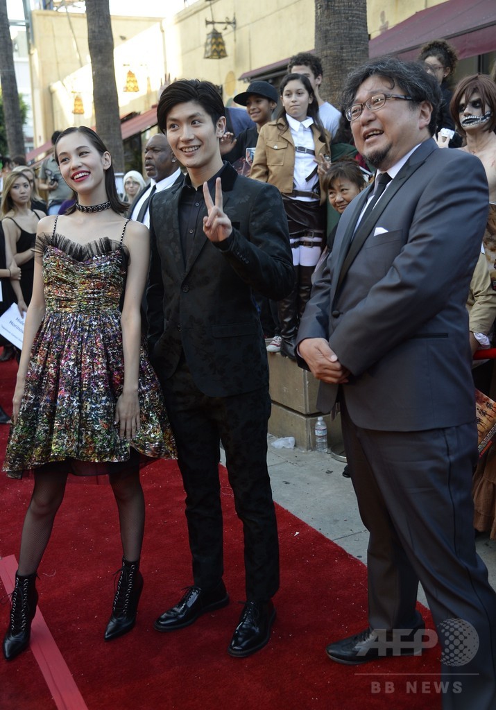 【7月15日 AFP】米カリフォルニア(California)州ハリウッド(Hollywood)のエジプシャン・シアター(Egyptian Theatre)で14日、映画『進撃の巨人 ATTACK ON TITAN(Attack On Titan)』のワールドプレミア上映会が開催され、樋口真嗣(Shinji Higuchi)監督と、出演者の三浦春馬(Haruma Miura)さん、水原希子(Kiko Mizuhara)さんが出席した。本作は、同名のダークファンタジー漫画を実写化した作品。(c)AFP