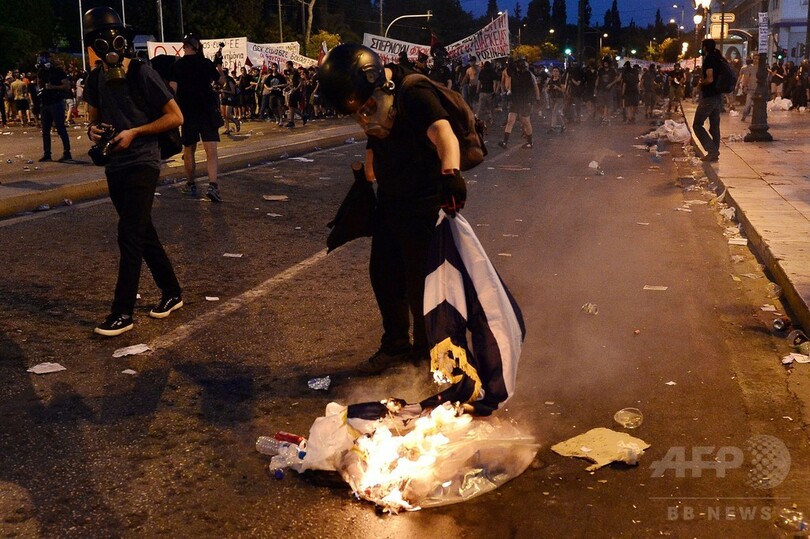 【7月16日 AFP】ギリシャの首都アテネ(Athens)中心部の議会前広場で15日、欧州など債権団から金融支援協議の条件とされた財政改革法案の採決に抗議していた緊縮反対派の抗議デモが一部で暴徒化し、警察と衝突した。