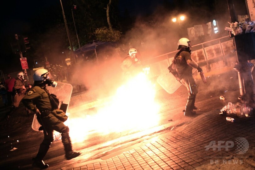 【7月16日 AFP】ギリシャの首都アテネ(Athens)中心部の議会前広場で15日、欧州など債権団から金融支援協議の条件とされた財政改革法案の採決に抗議していた緊縮反対派の抗議デモが一部で暴徒化し、警察と衝突した。