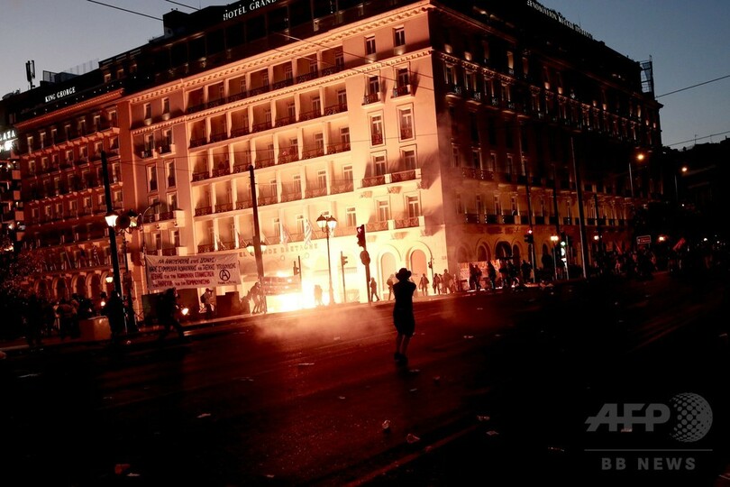 【7月16日 AFP】ギリシャの首都アテネ(Athens)中心部の議会前広場で15日、欧州など債権団から金融支援協議の条件とされた財政改革法案の採決に抗議していた緊縮反対派の抗議デモが一部で暴徒化し、警察と衝突した。