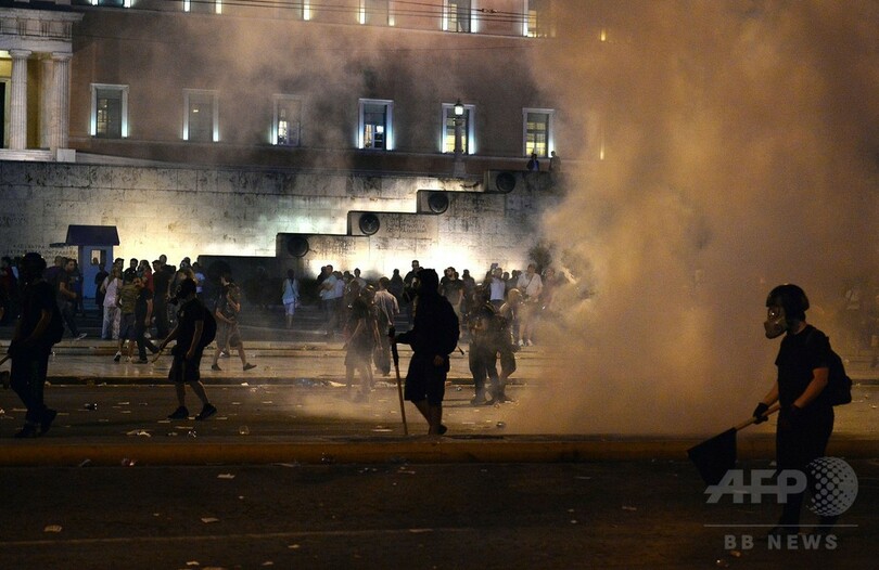【7月16日 AFP】ギリシャの首都アテネ(Athens)中心部の議会前広場で15日、欧州など債権団から金融支援協議の条件とされた財政改革法案の採決に抗議していた緊縮反対派の抗議デモが一部で暴徒化し、警察と衝突した。