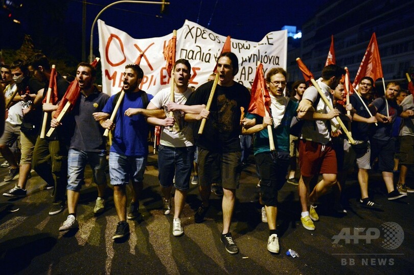 【7月16日 AFP】ギリシャの首都アテネ(Athens)中心部の議会前広場で15日、欧州など債権団から金融支援協議の条件とされた財政改革法案の採決に抗議していた緊縮反対派の抗議デモが一部で暴徒化し、警察と衝突した。