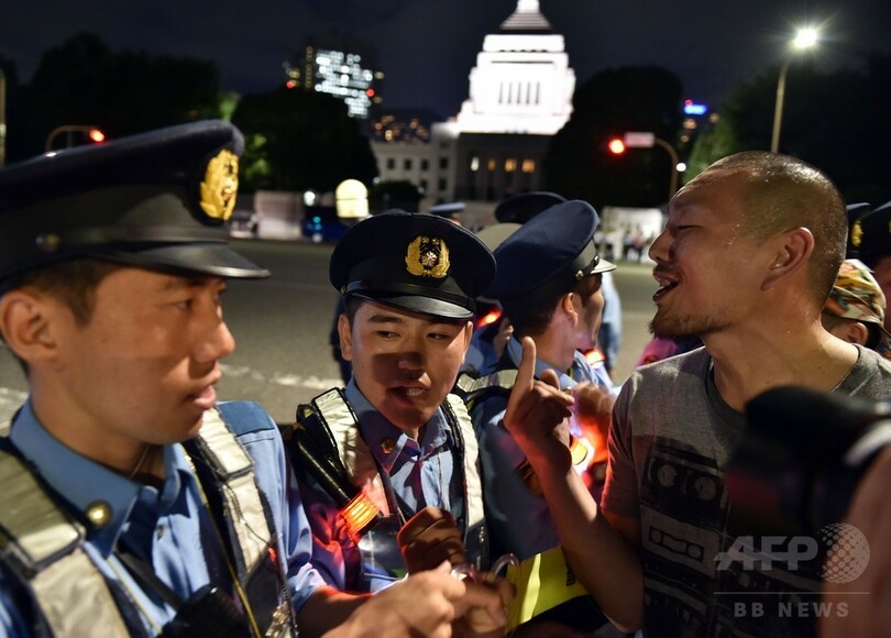 国民の間では安保関連法案に対する怒りの声も相次いでおり、衆院の特別委員会で法案が可決された15日には国会前で約6万人が抗議デモを行った。(c)AFP