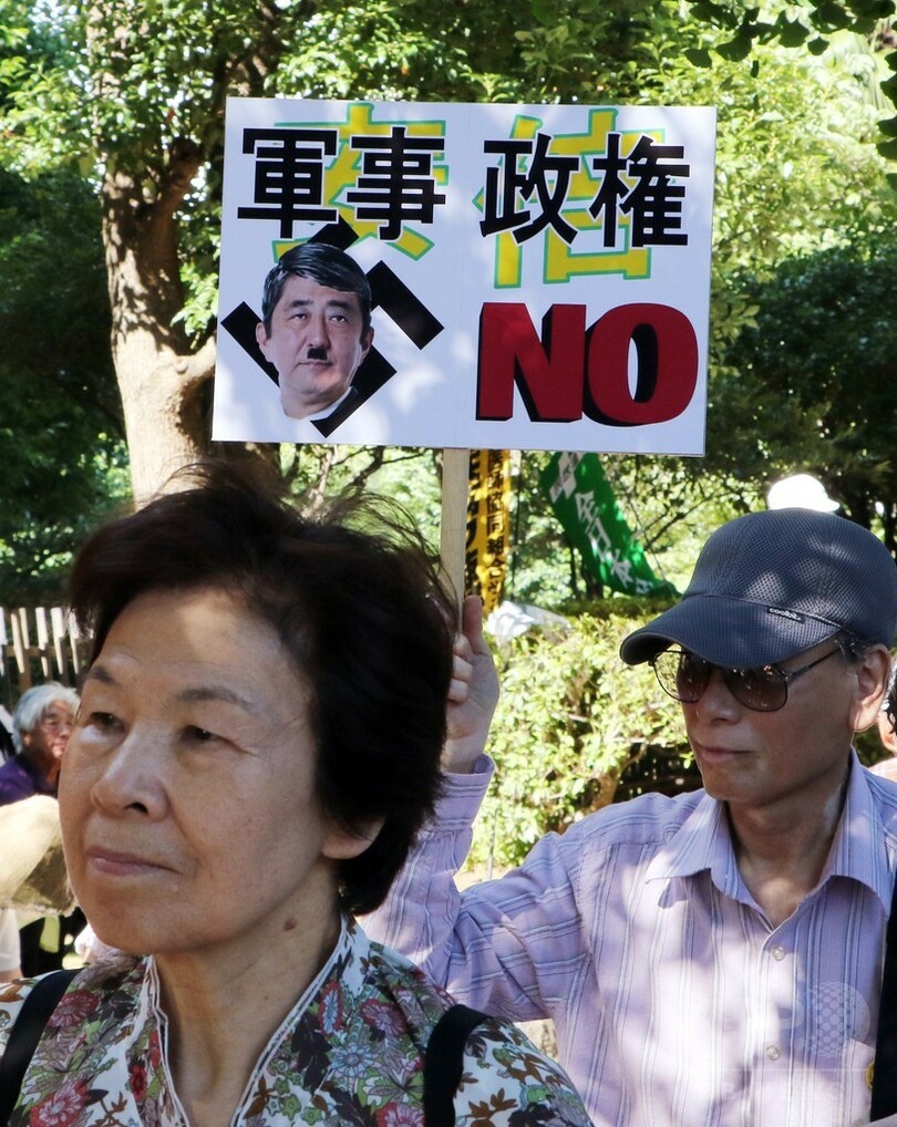 国民の間では安保関連法案に対する怒りの声も相次いでおり、衆院の特別委員会で法案が可決された15日には国会前で約6万人が抗議デモを行った。(c)AFP