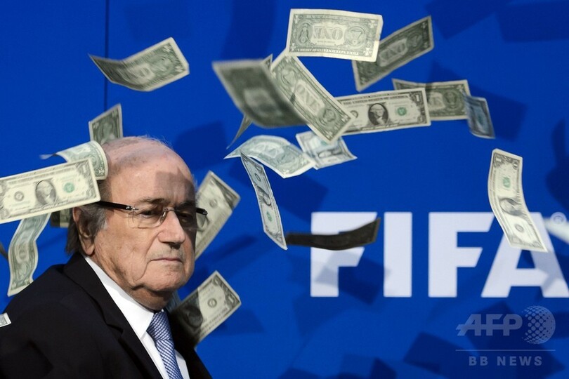 FIFA会長の会見でハプニング、英コメディアンが偽札ばらまく