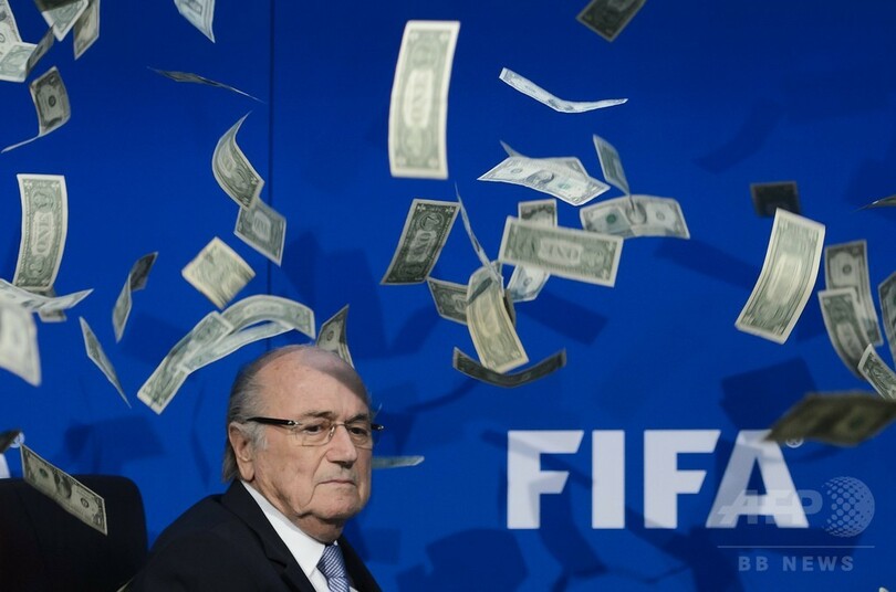 FIFA会長の会見でハプニング、英コメディアンが偽札ばらまく