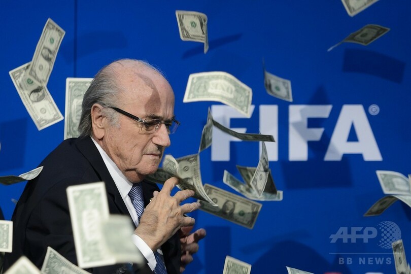 FIFA会長の会見でハプニング、英コメディアンが偽札ばらまく