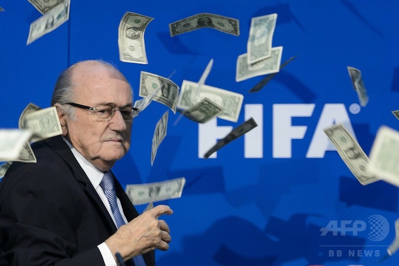 FIFA会長の会見でハプニング、英コメディアンが偽札ばらまく