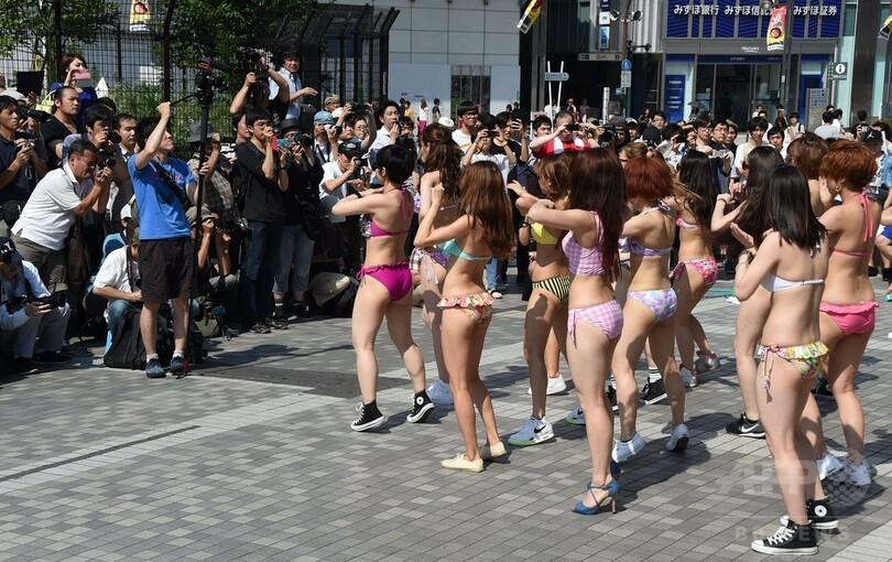 【7月21日 AFP】東京都内で20日、女性30人がTシャツを脱ぎビキニ姿でダンスを披露する「フラッシュモブ」が行われた。新作水着のプロモーションのため日本スイムスーツ協会(Japan Swimsuit Association)が実施したもの。(c)AFP