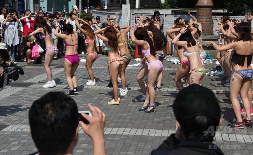 【7月21日 AFP】東京都内で20日、女性30人がTシャツを脱ぎビキニ姿でダンスを披露する「フラッシュモブ」が行われた。新作水着のプロモーションのため日本スイムスーツ協会(Japan Swimsuit Association)が実施したもの。(c)AFP