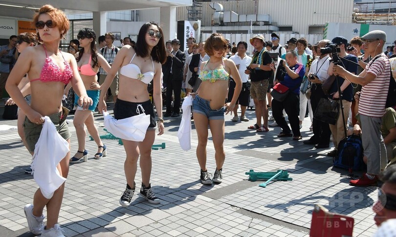 【7月21日 AFP】東京都内で20日、女性30人がTシャツを脱ぎビキニ姿でダンスを披露する「フラッシュモブ」が行われた。新作水着のプロモーションのため日本スイムスーツ協会(Japan Swimsuit Association)が実施したもの。(c)AFP