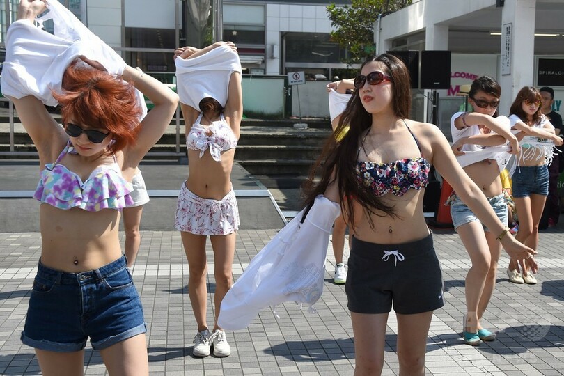 【7月21日 AFP】東京都内で20日、女性30人がTシャツを脱ぎビキニ姿でダンスを披露する「フラッシュモブ」が行われた。新作水着のプロモーションのため日本スイムスーツ協会(Japan Swimsuit Association)が実施したもの。(c)AFP