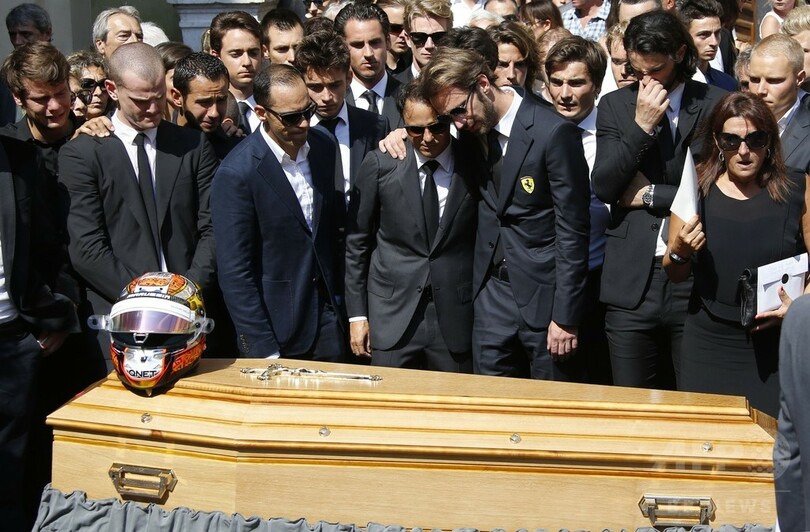 日本GP(Japan Grand Prix 2014)で大事故に遭ってから9か月後に亡くなった元マルシャ(Marussia F1 Team)のビアンキ選手の葬儀には、親族や友人だけでなく、F1年間王者ルイス・ハミルトン(Lewis Hamilton)や、ピットレーンで肩を並べた仲間たちが姿をみせた。
