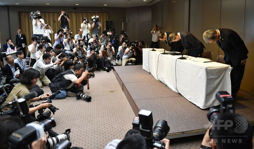 田中社長らの辞任は、数年にわたって行われていた利益のかさ上げを意図した会計処理に経営トップが「組織的に」関与していたと結論付けた第三者委員会による調査報告書を受けたもの。この問題は、日本で起きた中ではここ数年で最大規模の不正会計スキャンダルとなった。(c)AFP