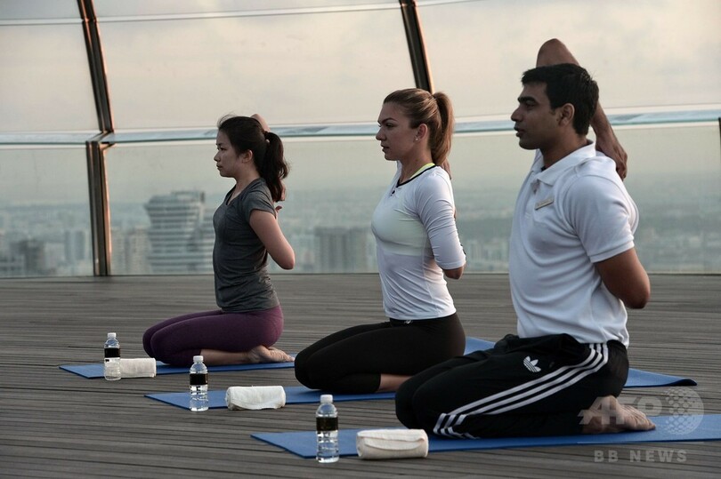 ハレプは、高級リゾートホテルのマリーナ・ベイ・サンズ(Marina Bay Sands)にある展望デッキでヨガを行った。(c)AFP