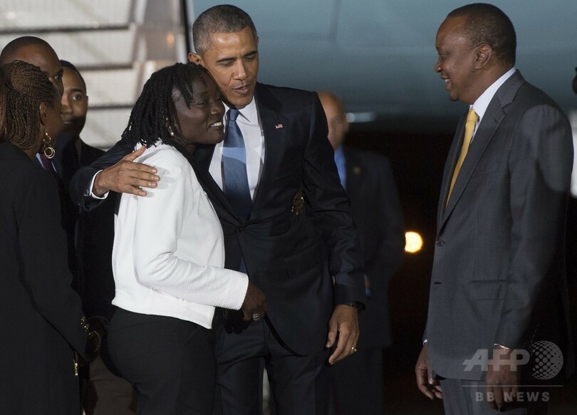 米大統領専用機エアフォースワン(Air Force One)から降り立ったオバマ大統領は、ケニアのウフル・ケニヤッタ(Uhuru Kenyatta)大統領に迎えられた。またオバマ大統領の異母姉アウマ・オバマ(Auma Obama)さんも空港で同大統領を出迎え、大統領用の防弾リムジンに同乗してナイロビ中央部のホテルに移動した。オバマ大統領はその後、アウマさんや祖母のサラ・オバマ(Sarah Obama)さんら、ケニアの親族たちと食事をした。
