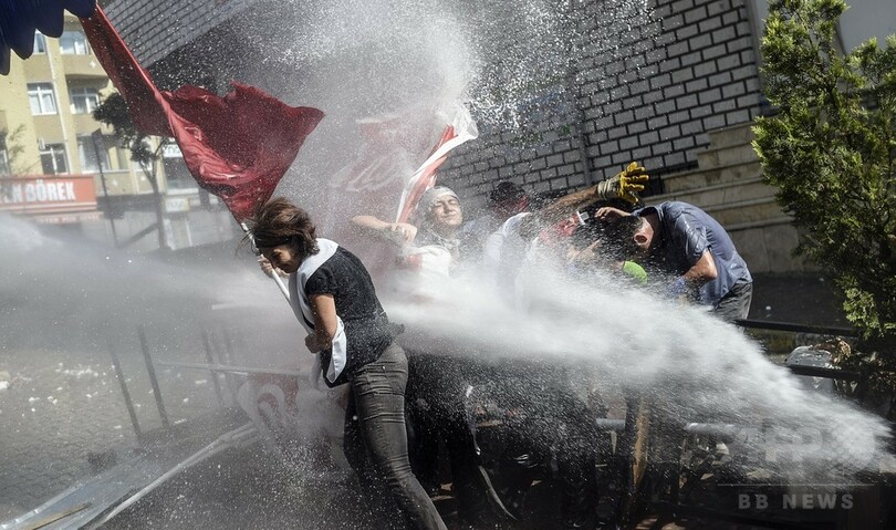 トルコ国内では緊張が高まっており、イスタンブール(Istanbul)では26日、前週のテロ容疑者一斉摘発に抗議するデモ隊と警官隊が衝突して、警察官1人が死亡した。国内各地でもISやトルコ政府のシリア政策に反対するデモが相次ぎ、警察が放水などで鎮圧に当たっている。(c)AFP/Stuart WILLIAMS
