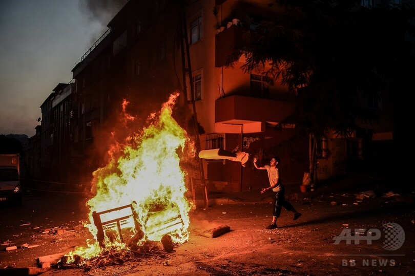 トルコ国内では緊張が高まっており、イスタンブール(Istanbul)では26日、前週のテロ容疑者一斉摘発に抗議するデモ隊と警官隊が衝突して、警察官1人が死亡した。国内各地でもISやトルコ政府のシリア政策に反対するデモが相次ぎ、警察が放水などで鎮圧に当たっている。(c)AFP/Stuart WILLIAMS